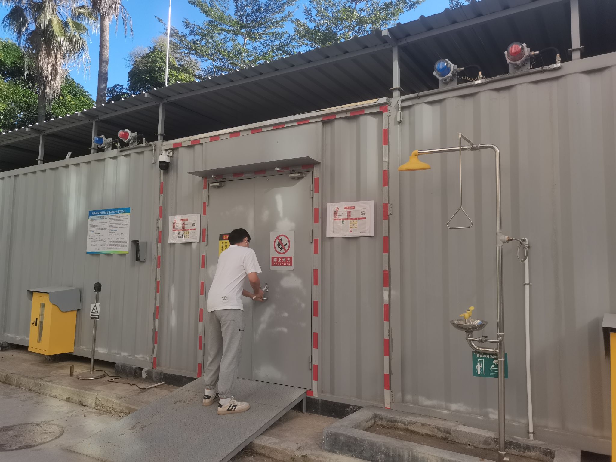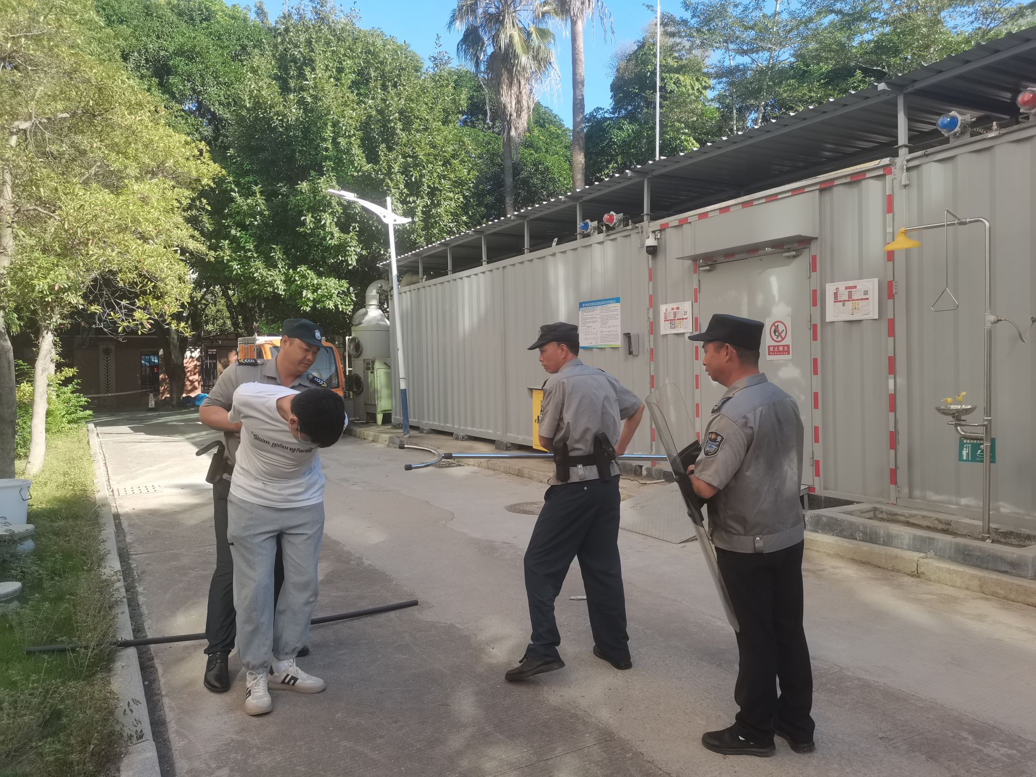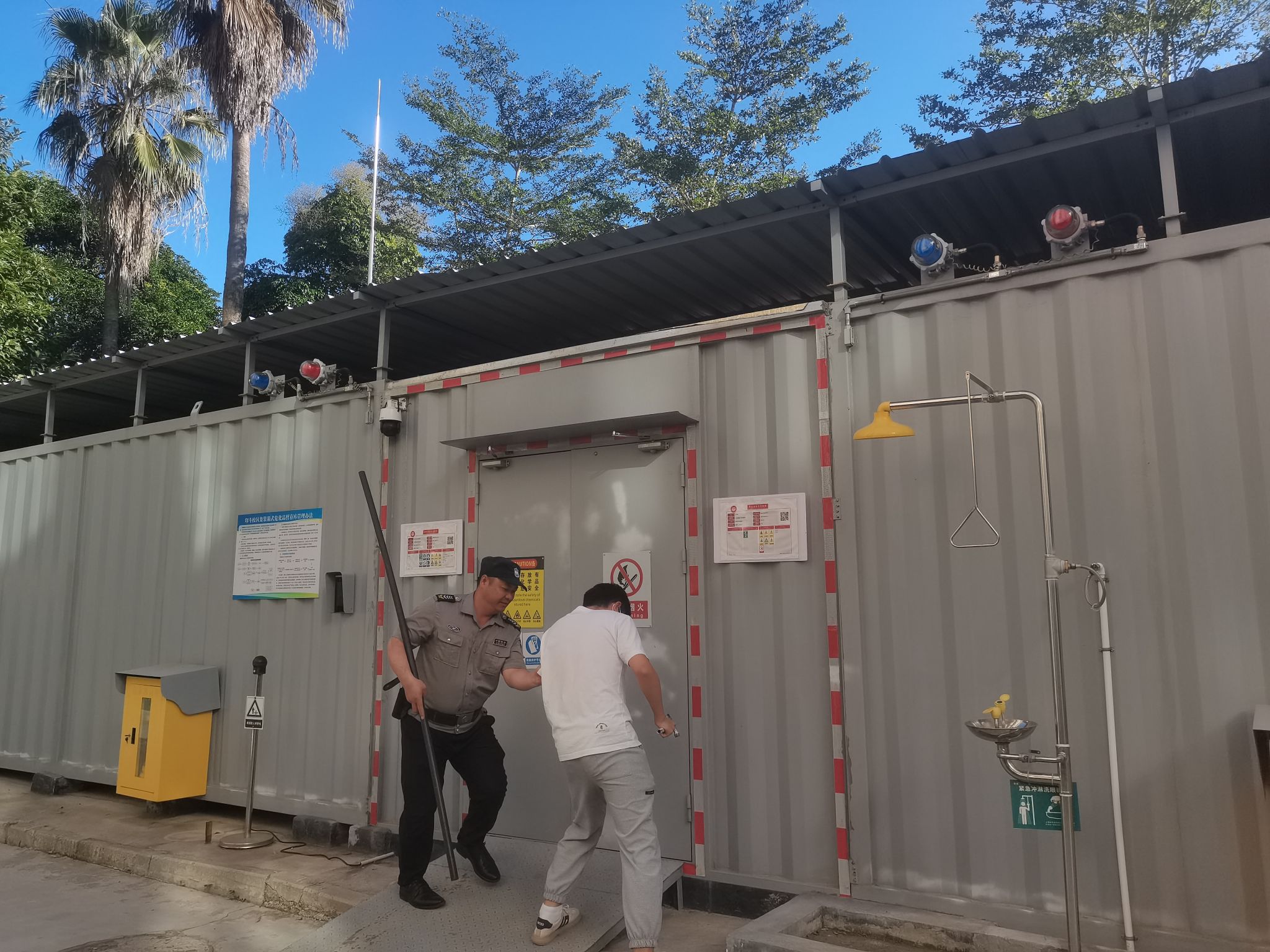 演练开始,模拟一名不明身份的人员试图破门进入危化品暂存间。