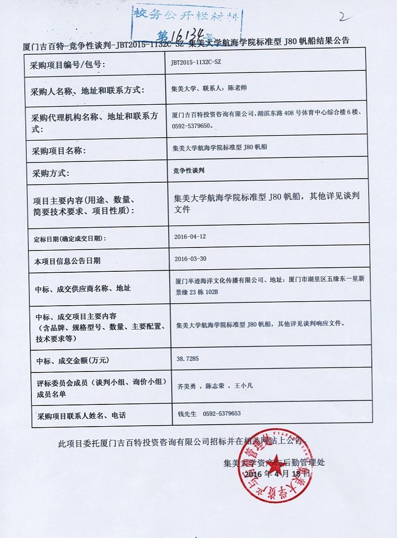 厦门吉白特—竞争性谈判—JBT2015-1132C-SZ-集美大学航海学院标准型J80帆船结果公告