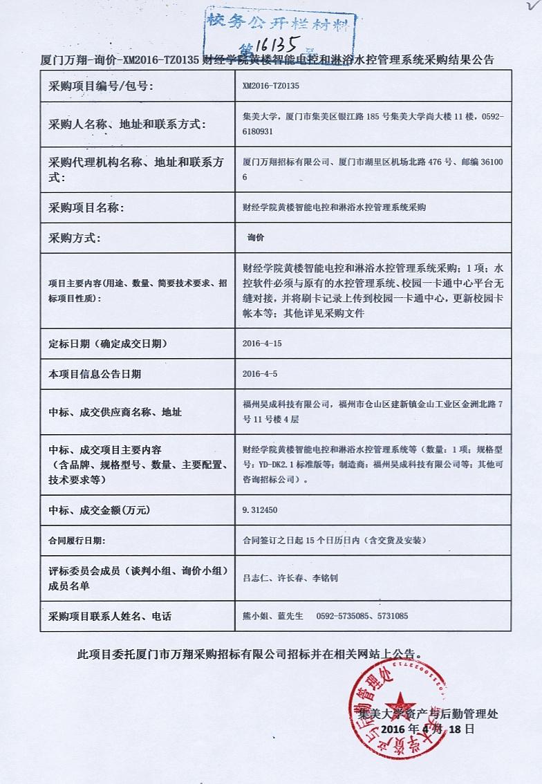 厦门万翔—询价—XM2016-TZ0135财经学院黄楼智能电控和淋浴水控管理系统采购结果公告