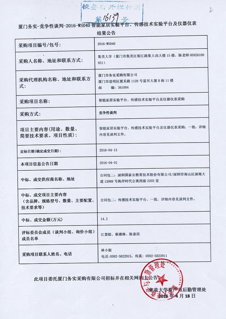 厦门务实—竞争性谈判—2015—WS040智能家居实验平台、传感技术实验平台及仪器仪表结果公告