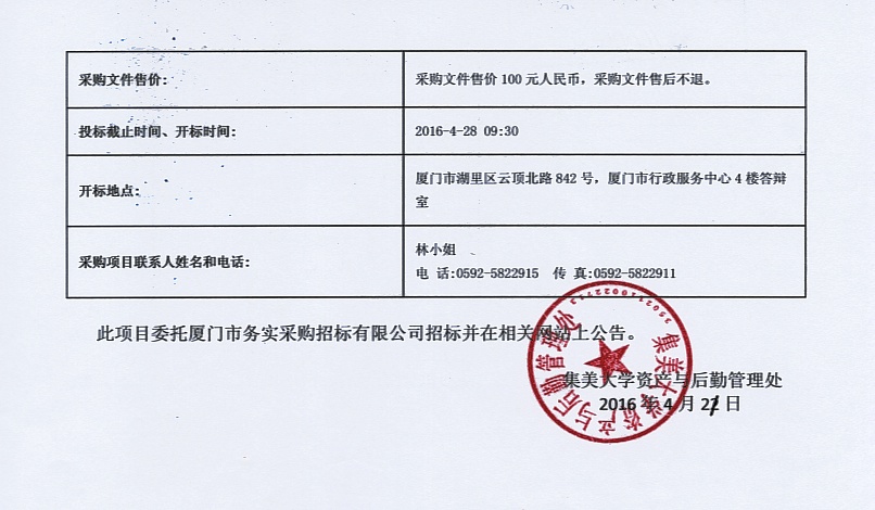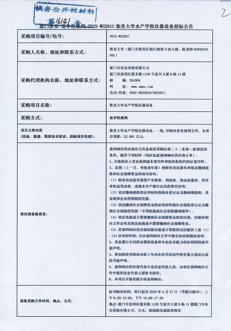 厦门务实—竞争性谈判—2015—WS291C集美大学水产学院仪器设备招标公告