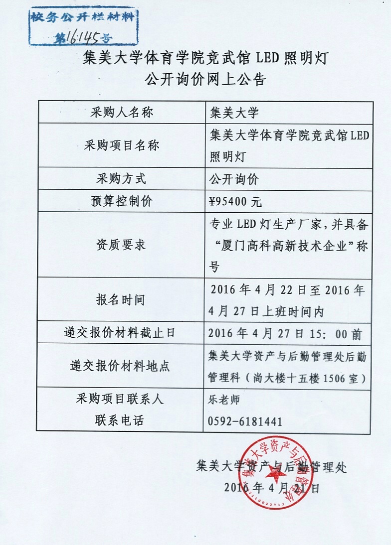 集美大学体育学院竞武馆LED照明灯公开询价网上公告