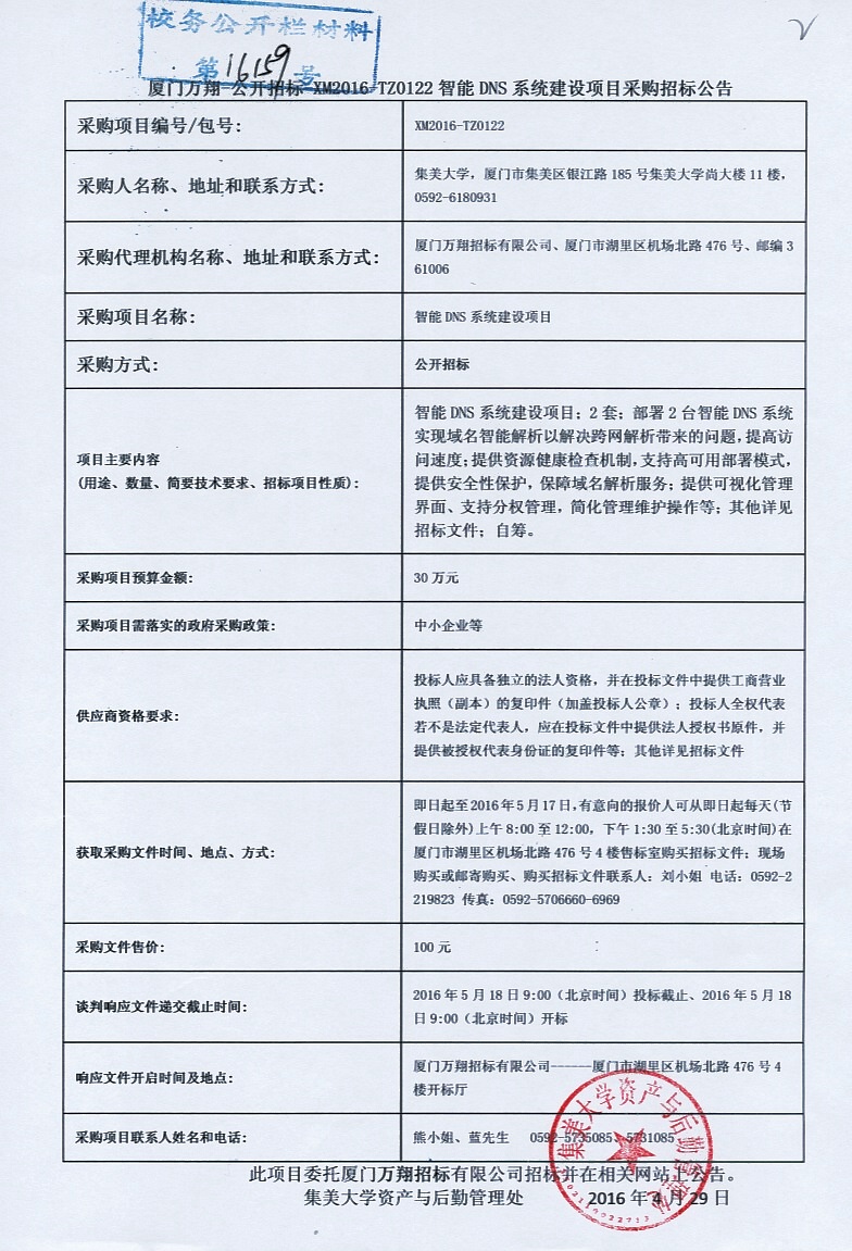 厦门万翔—公开招标—XM2016-TZ0122智能DNS系统建设项目采购招标公告