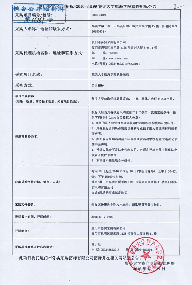 厦门务实—公开招标—2016—SH199集美大学航海学院软件招标公告