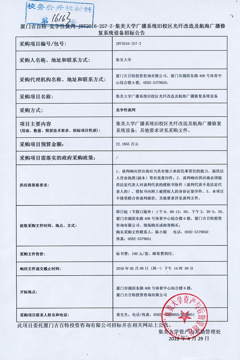 厦门吉白特—竞争性谈判—JB2016-257-Z-集美大学广播系统旧校区光纤改造及航海广播修复系统设备招标公告