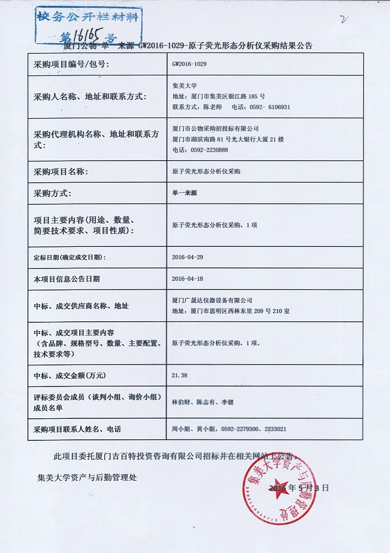厦门公物—单一来源—GW2016-1029-原子荧光形态分析仪采购结果公告