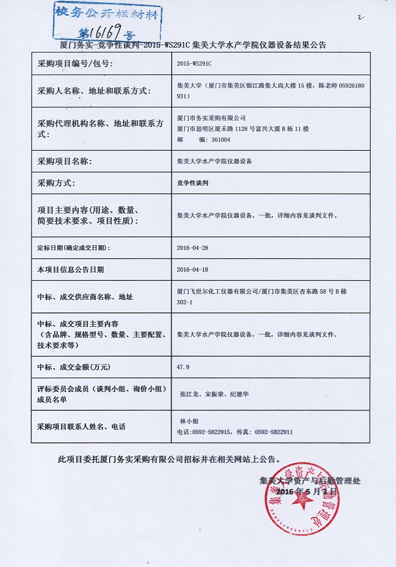 厦门务实—竞争性谈判—2015—WS291C集美大学水产学院仪器设备结果公告