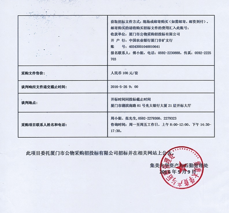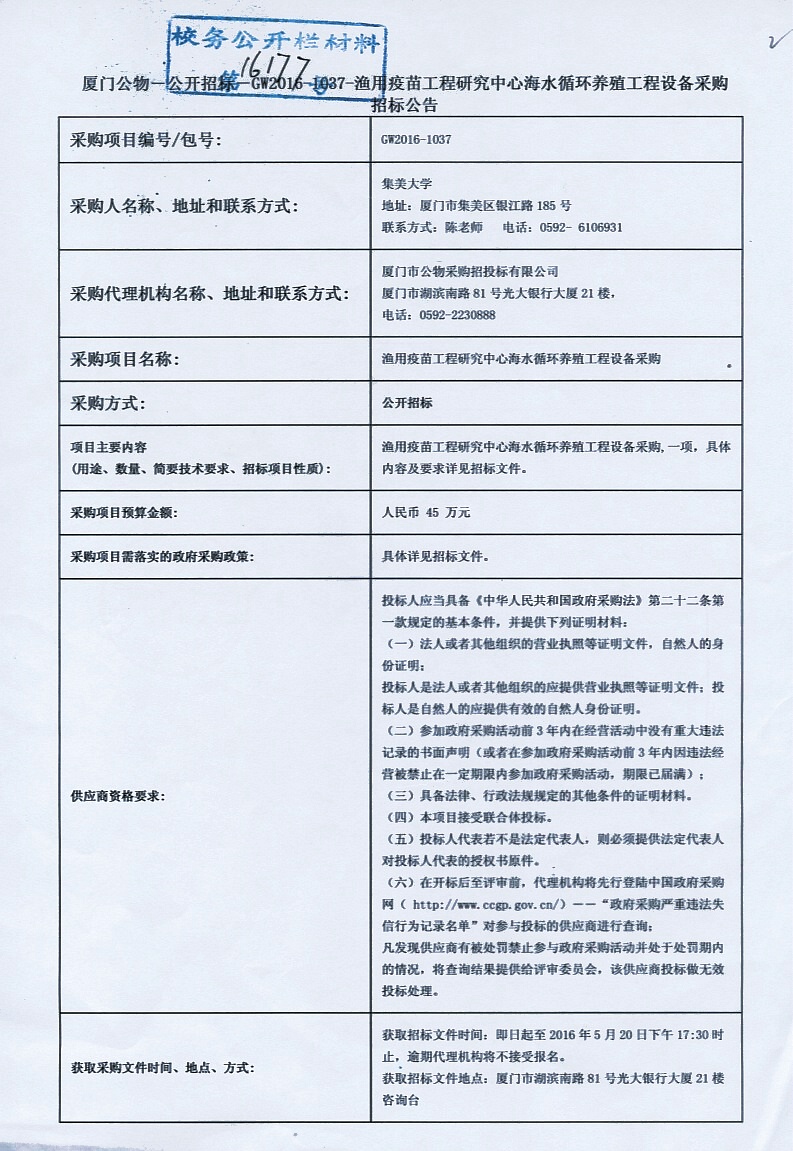厦门公物—公开招标—GW2016-1037-渔用疫苗工程研究中心海水循环养殖工程设备采购招标公告
