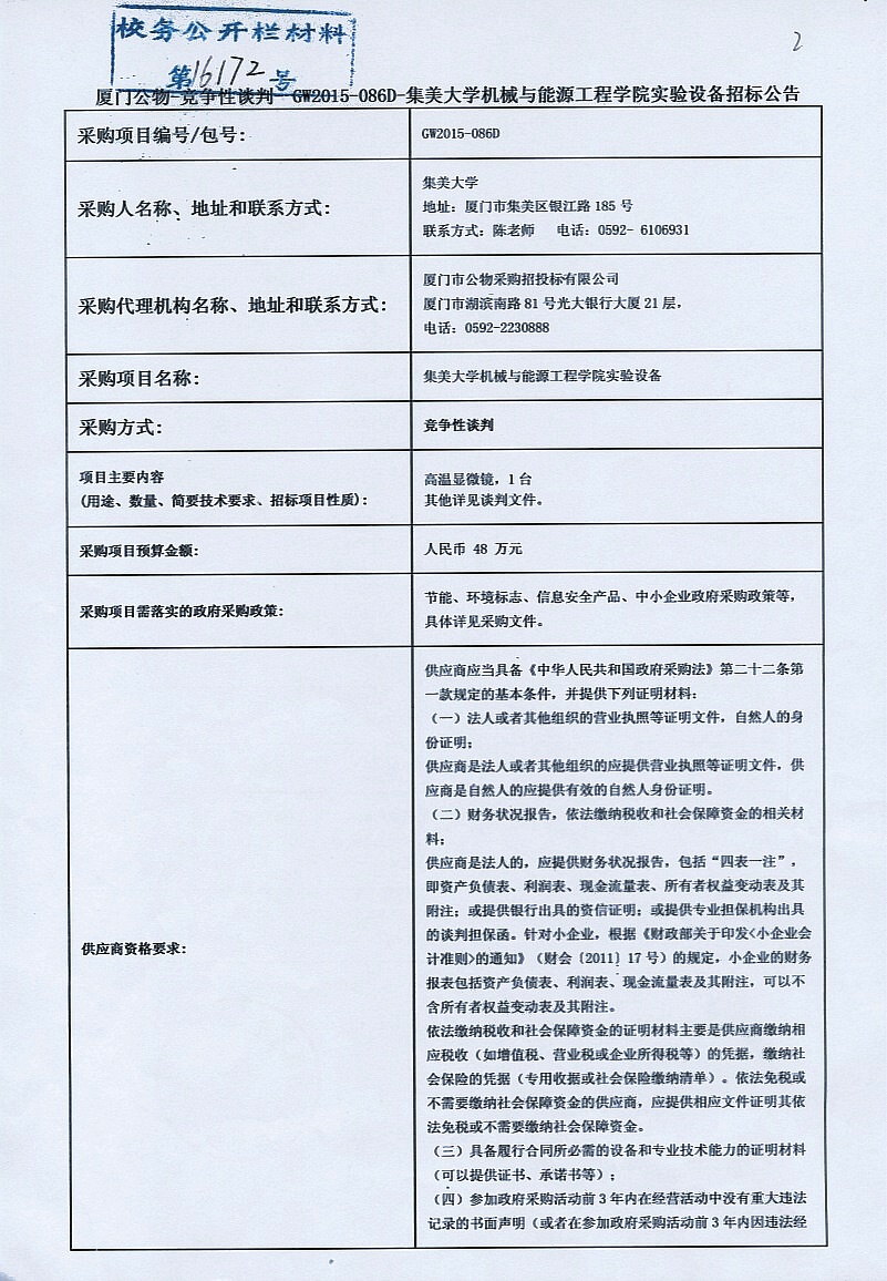 厦门公物—竞争性谈判—GW2015-086D-集美大学机械与能源工程学院实验室设备招标公告