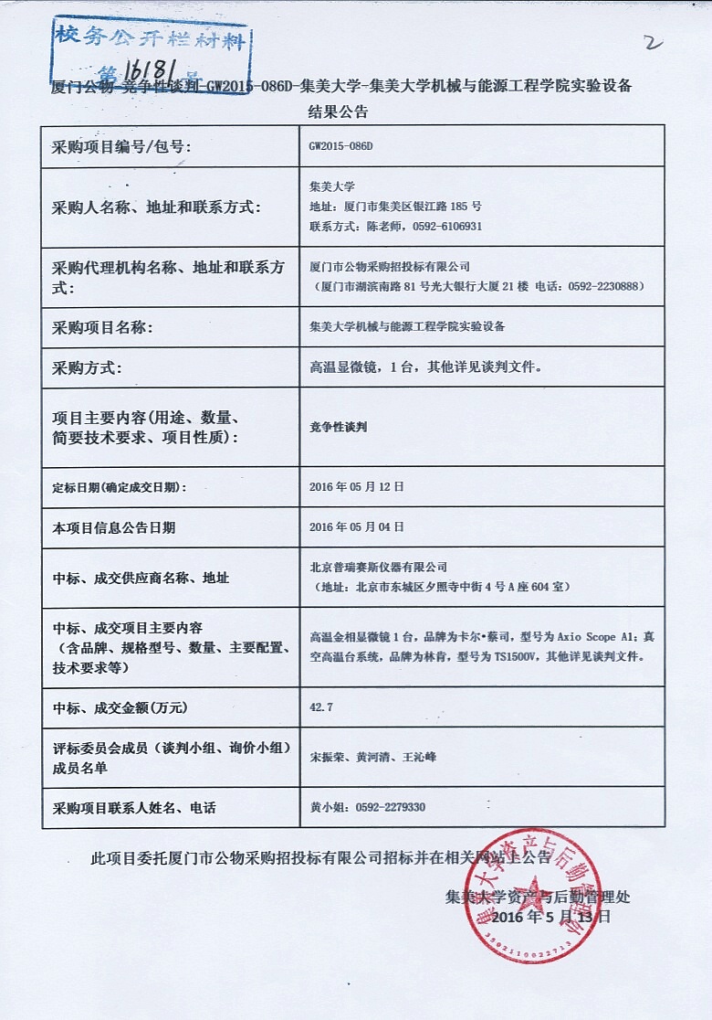 厦门公物—竞争性谈判—GW2015-086D-集美大学机械与能源工程学院实验室设备结果公告