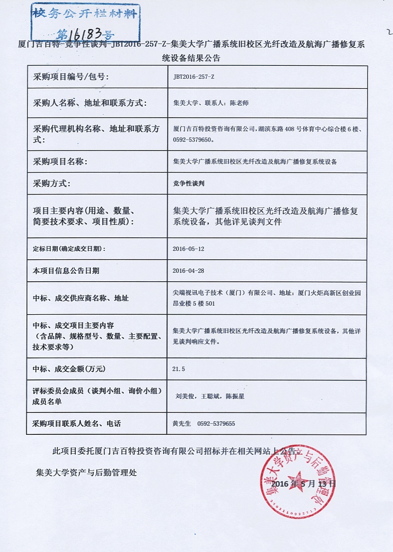 厦门吉白特—竞争性谈判—JB2016-257-Z-集美大学广播系统旧校区光纤改造及航海广播修复系统设备结果公告