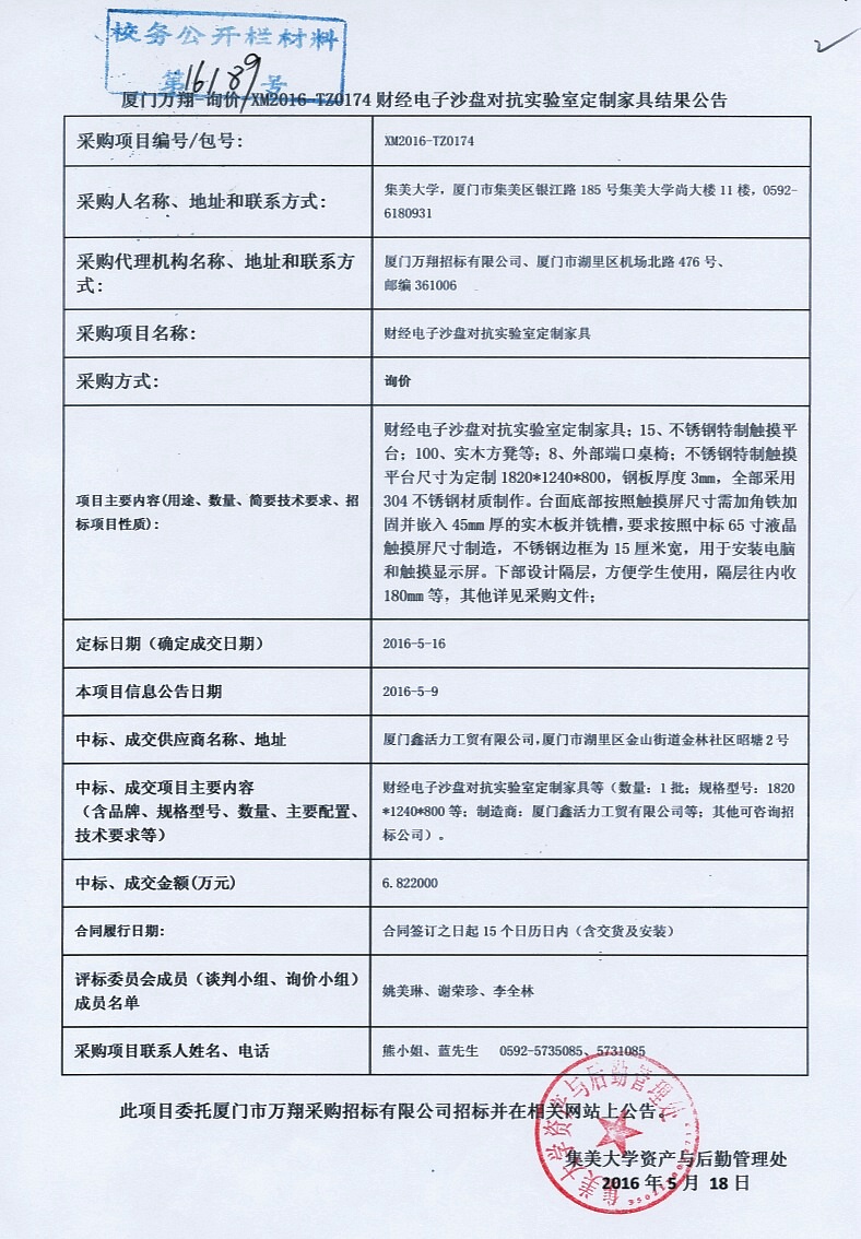 厦门万翔—询价—XM2016-tz0174财经电子沙盘对抗实验室定制家具结果公告