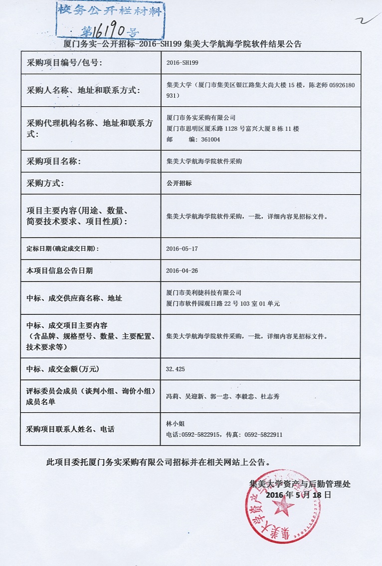 厦门务实—公开招标—2016—SH199集美大学航海学院软件结果公告