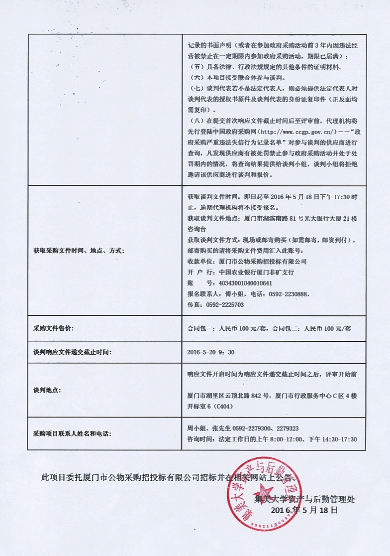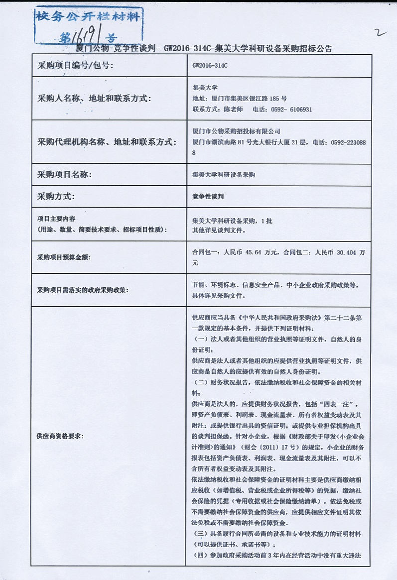 厦门公物—竞争性谈判—GW2016-314-集美大学科研设备采购招标公告
