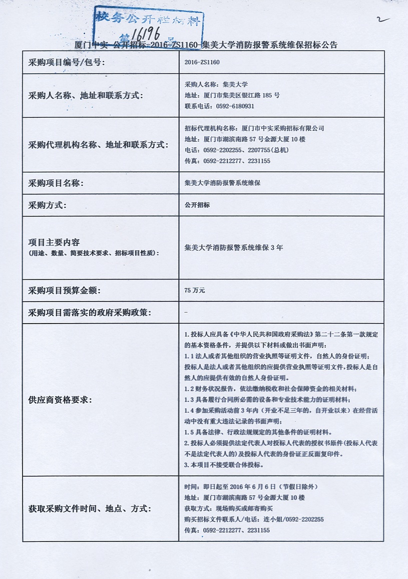 厦门中实—公开招标—2016—ZS1160-集美大学消防报警系统维保招标公告