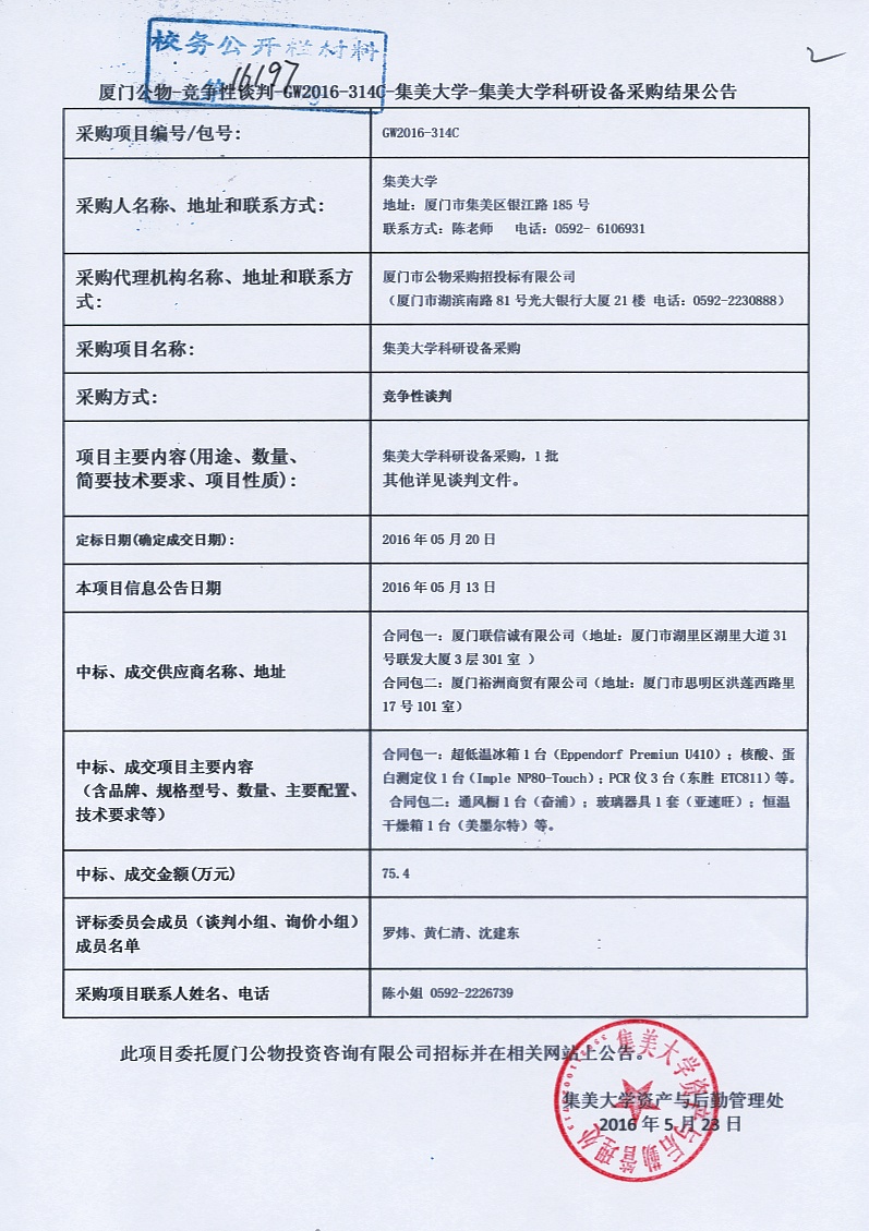 厦门公物—竞争性谈判—GW2016-314C-集美大学—集美大学科研设备采购结果公告