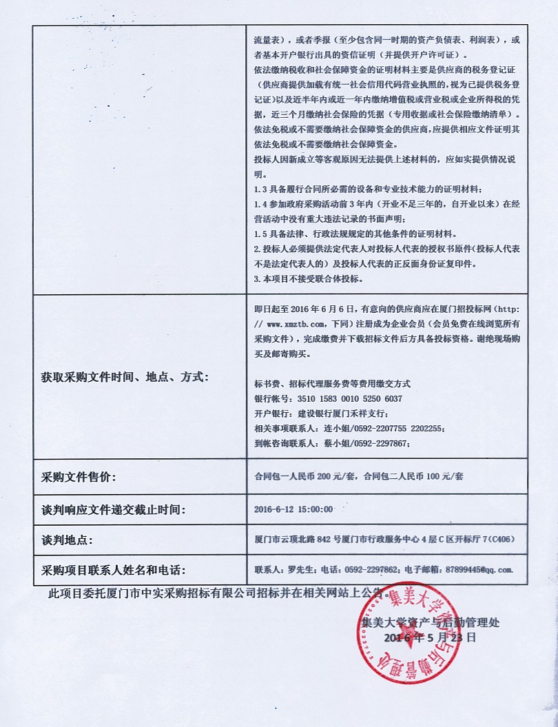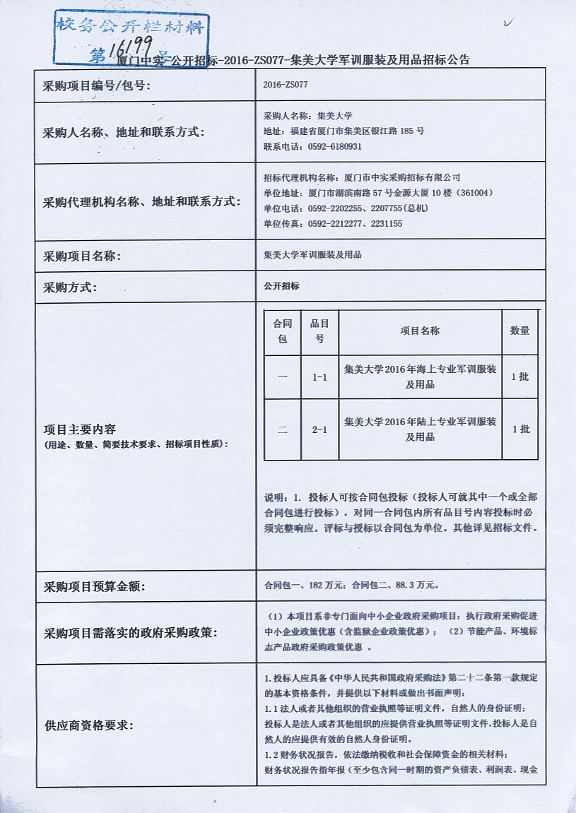 厦门中实—公开招标—2016—ZS077-集美大学军训服装及用品招标公告