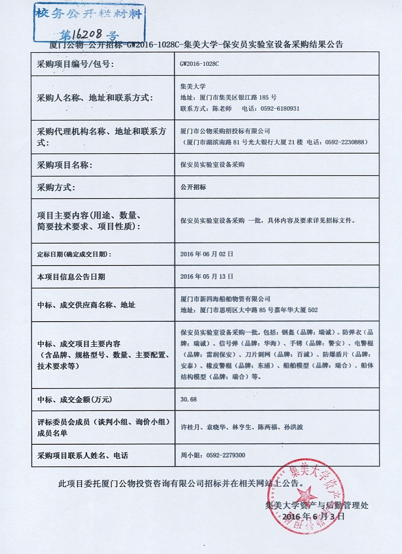 厦门公物—公开招标—GW2016-1028C-保安员实验室设备采购结果公告