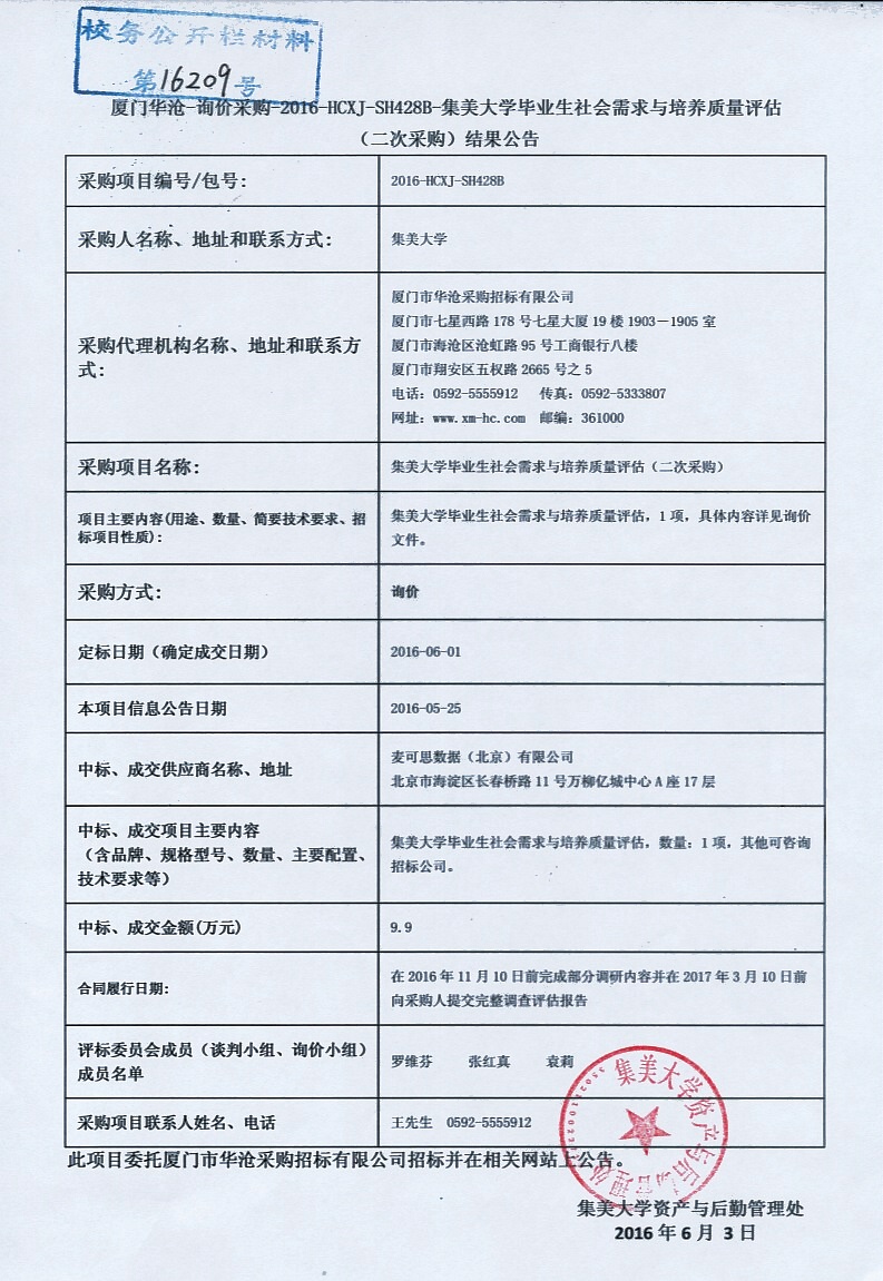厦门华沧—询价采购—2016—HCXJ-SH428B-集美大学毕业生社会需求余培养质量评估(二次采购)结果公告