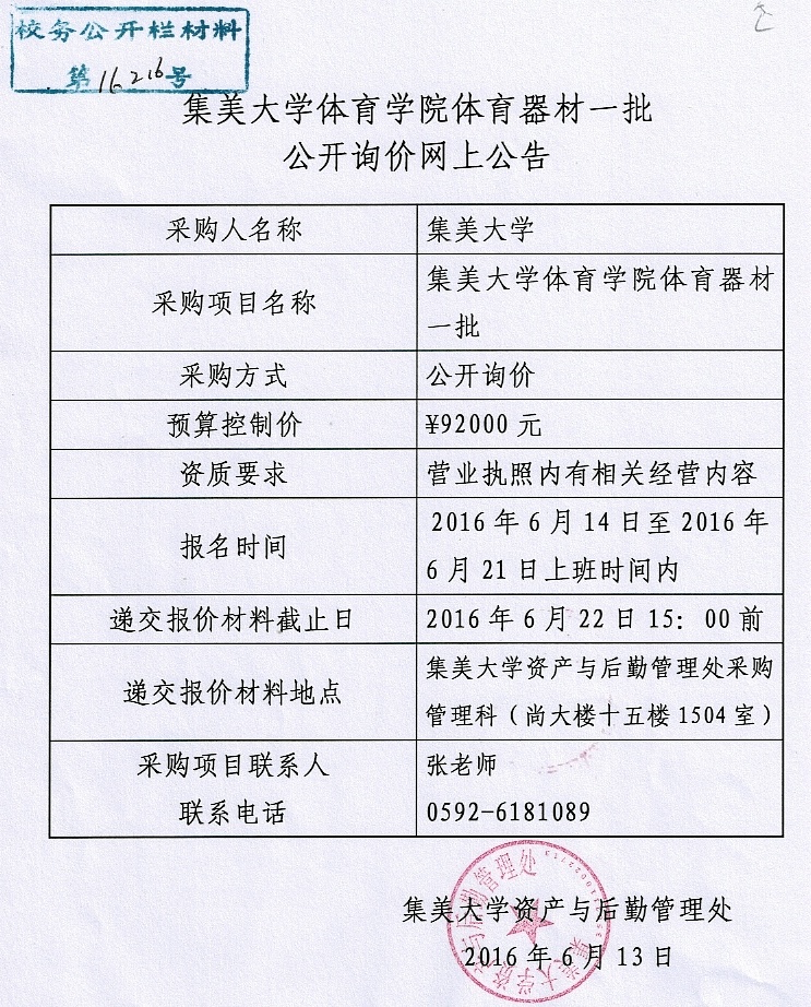 集美大学体育学院体育器材一批公开询价网上公告