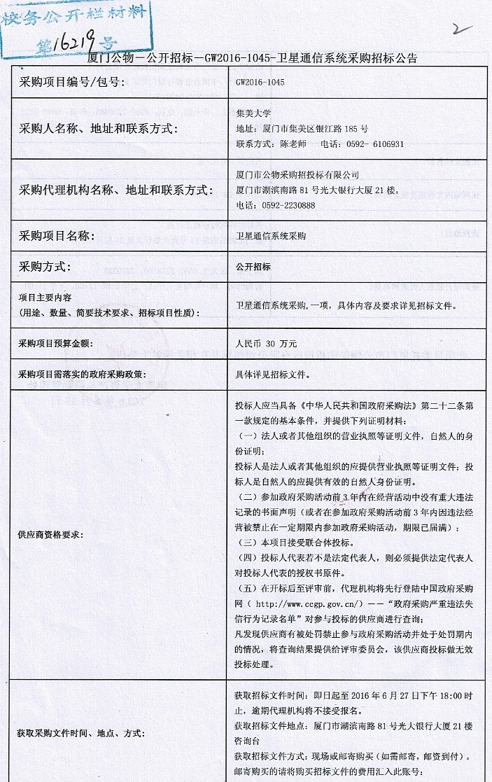 厦门公物-公开招标-GW2016-1045-卫星通信系统采购招标公告