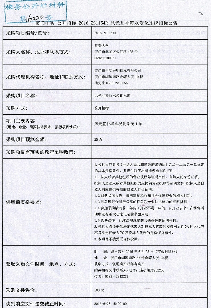 厦门中实-公开招标-2016-ZS1154R-风光互补海水淡化系统招标公告