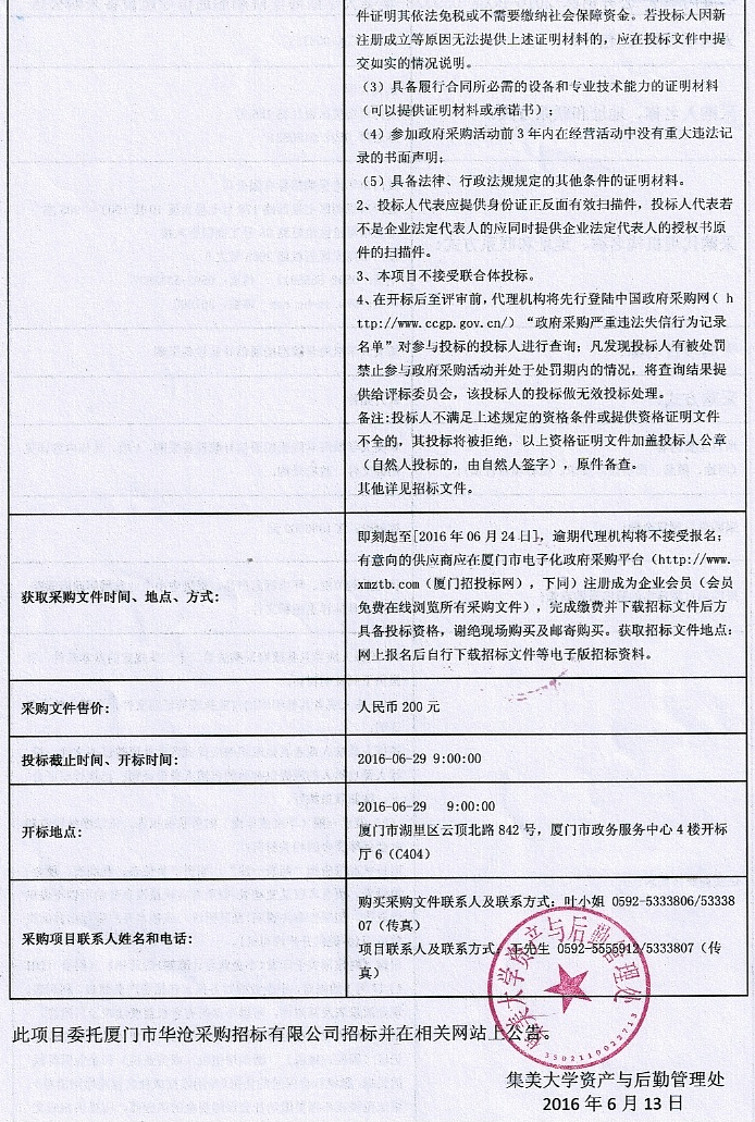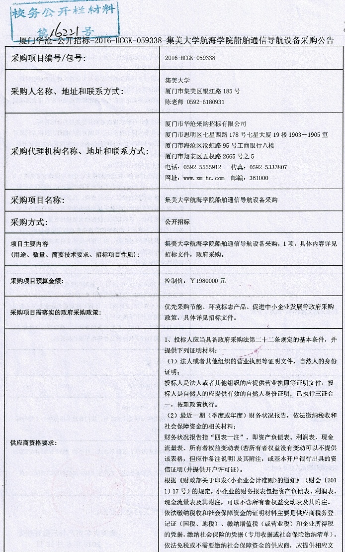 厦门华沧-公开招标-2016-HCGK-059338-集美大学航海学院船舶通信导航设备采购公告