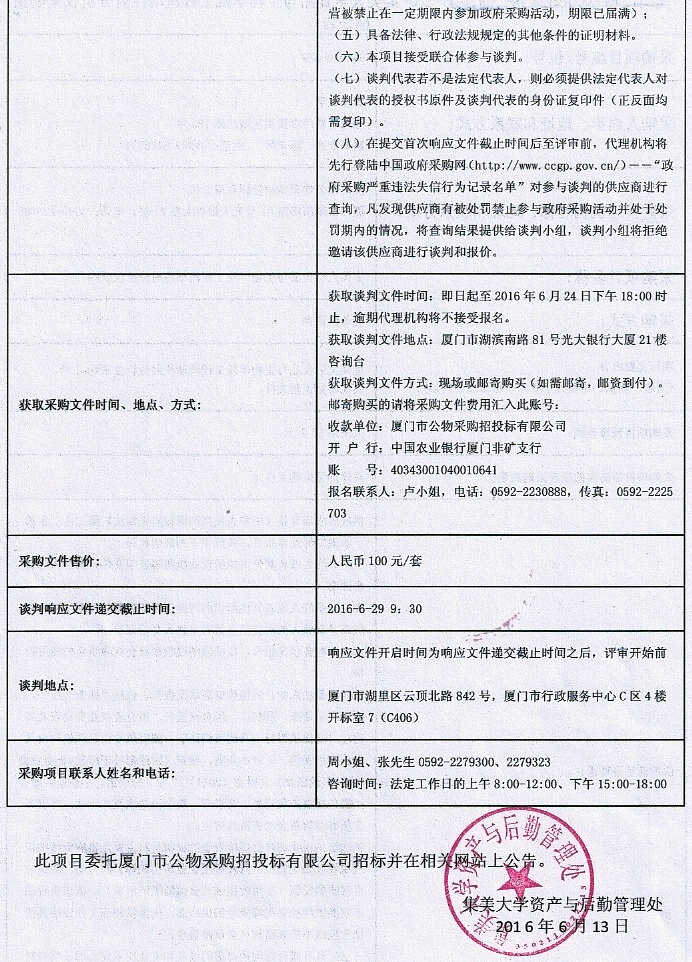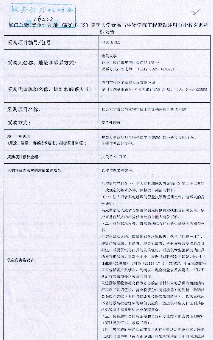 厦门公物-竞争性谈判- GW2016-320-集美大学食品与生物学院工程流动注射分析仪采购招标公告