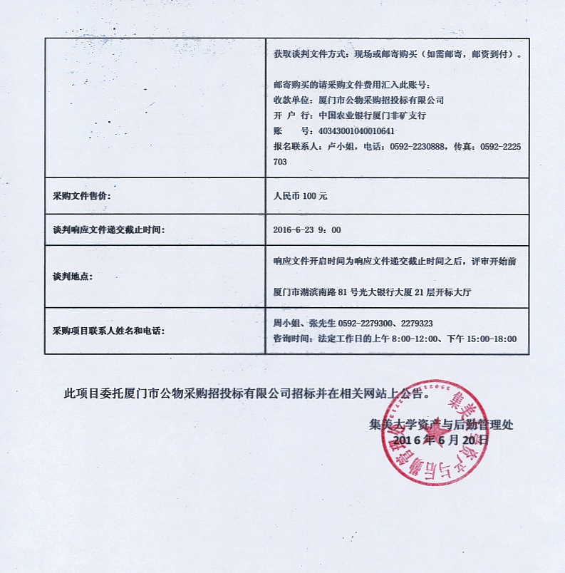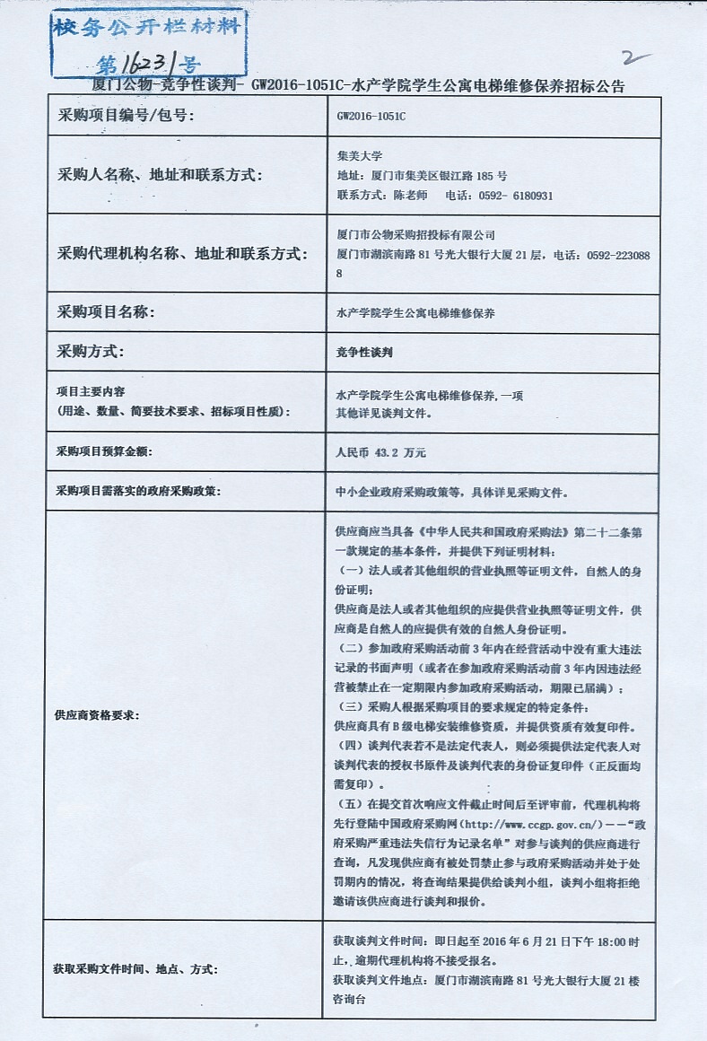 厦门公物—竞争性谈判—GW2016-1051C-水产学院学生公寓电梯维修保养招标公告