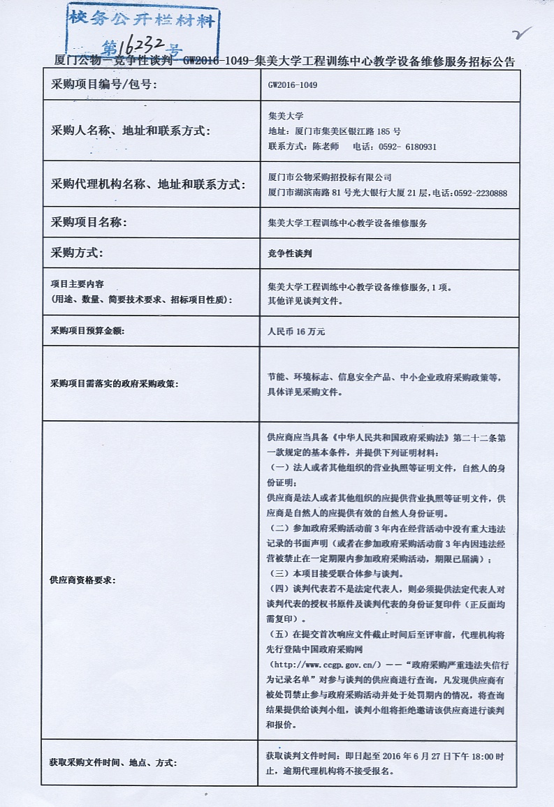 厦门公物—竞争性谈判—GW2016-1049-集美大学工程训练中心教学设备维修服务招标公告