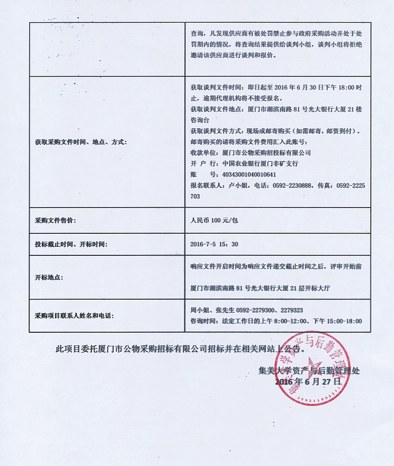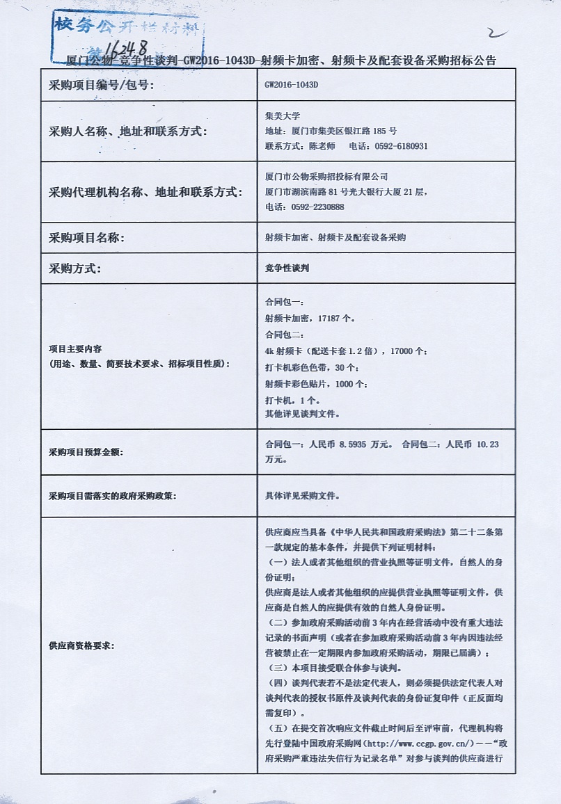 厦门公物—竞争性谈判—GW2016-1043D-射频卡加密、射频卡及配套设备采购招标公告