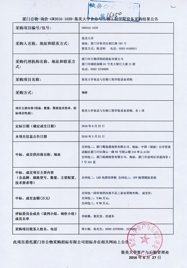 厦门公物—询价-GW2016-1039-集美大学食品与生物工程学院设备采购结果公告