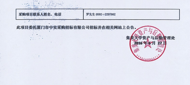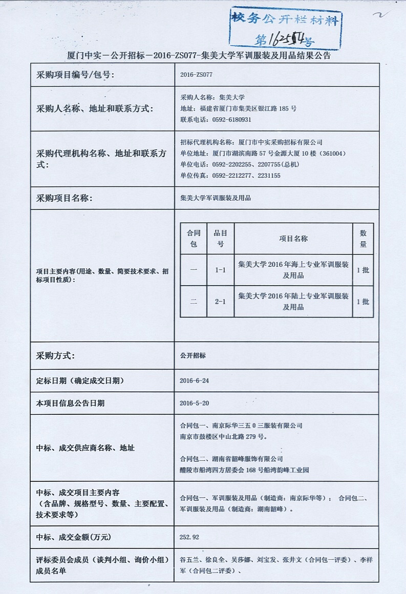 厦门中实—公开招标-2016-ZS077-集美大学军训服装及用品结果公告