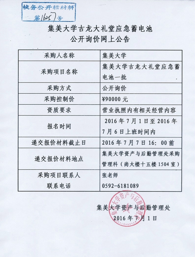 集美大学古龙大礼堂应急蓄电池公开询价网上公告