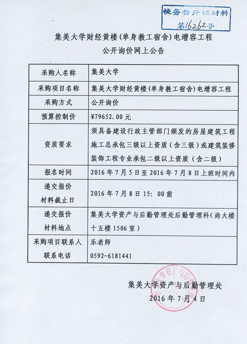 集美大学财经黄楼(单身教工宿舍)电增容工程公开询价网上公告