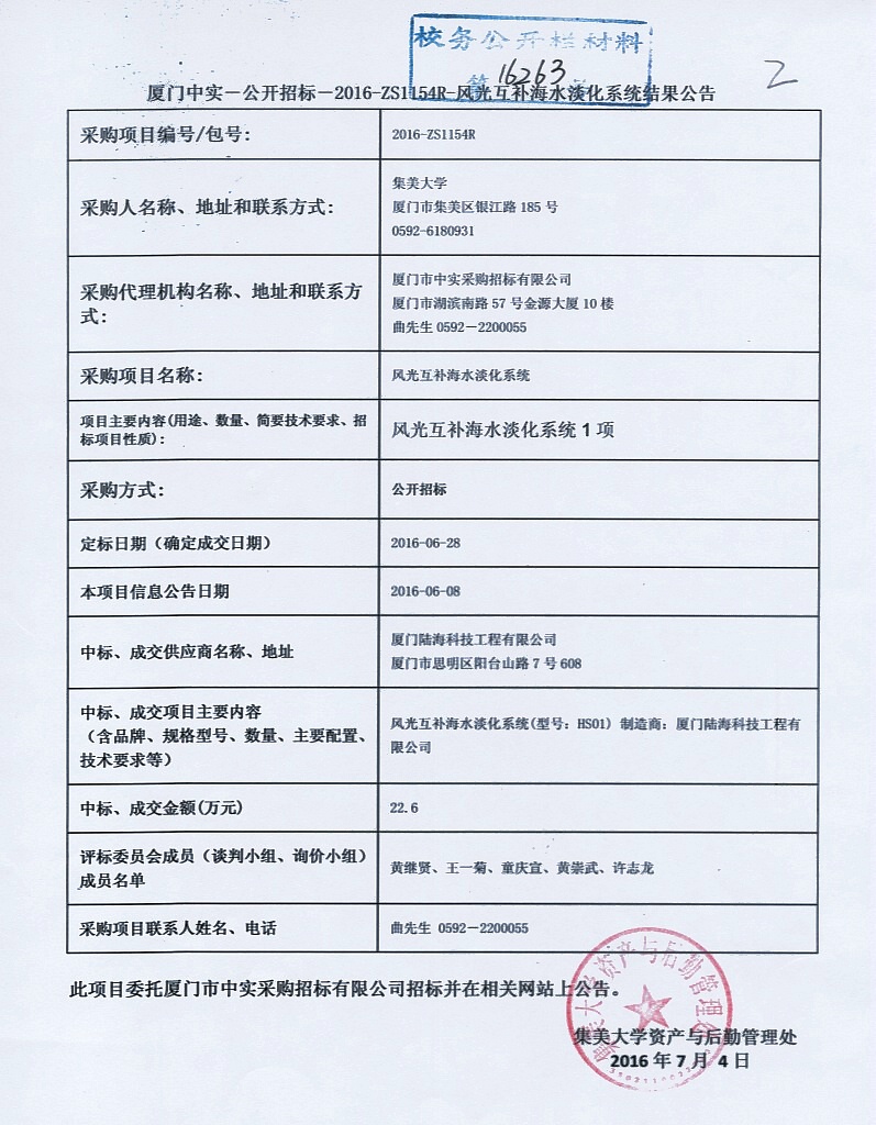 厦门中实—公开招标—2016—ZS1154R-风光互补海水淡化系统结果公告