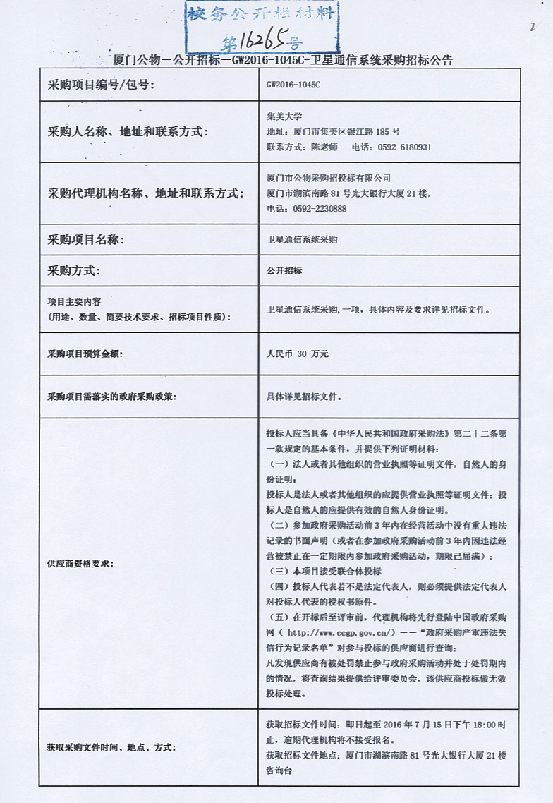 厦门公物—公开招标—GW2016-1045C-卫星通信系统采购招标公告
