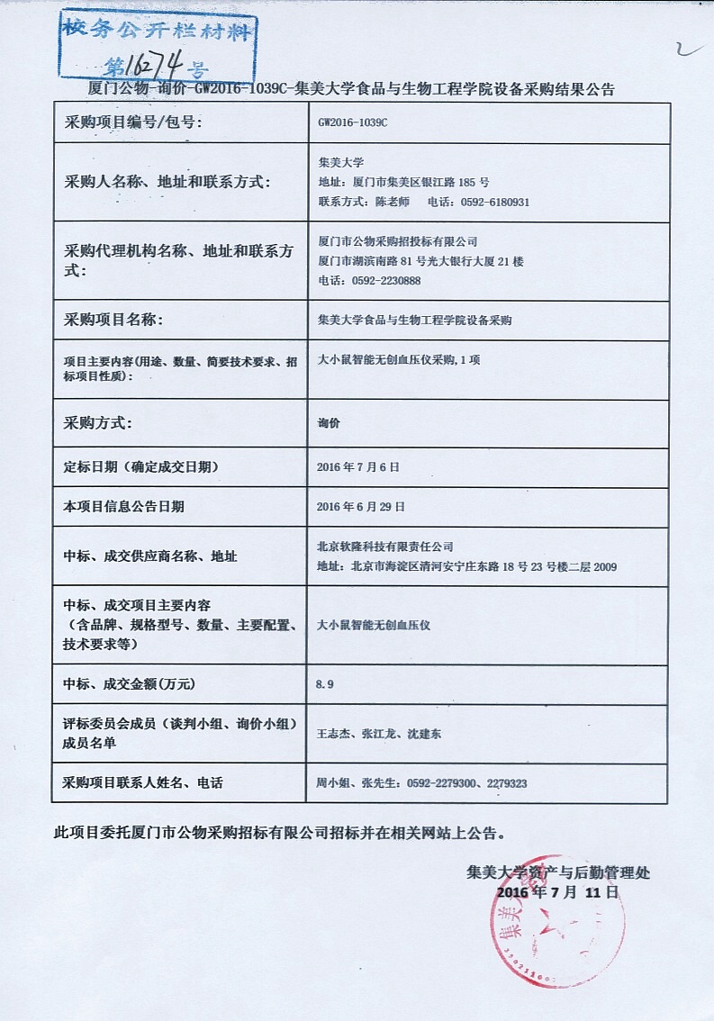 厦门公物—询价—GW2016-1039C-集美大学食品与生物工程学院设备采购结果公告