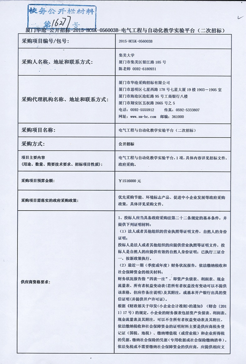 厦门华沧—公开招标—2015-HCGK-056003B-电气工程与自动化教学实验平台(二次招标)