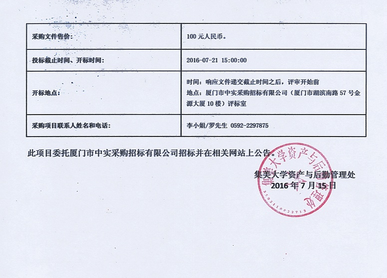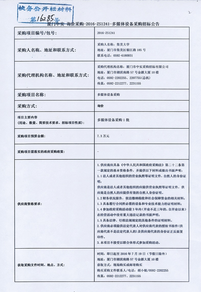 厦门中实—询价采购—2016—ZS1241-多媒体设备采购招标公告