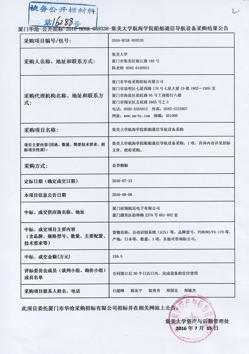 厦门华沧—公开招标—2016—HCGK—059338-集美大学航海学院船舶通信导航设备采购结果公告