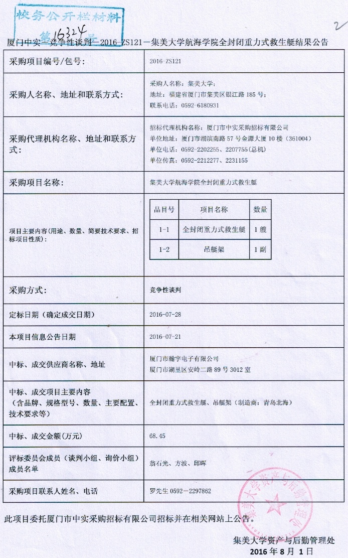 集美大学航海学院全封闭重力式救生艇采购结果公告