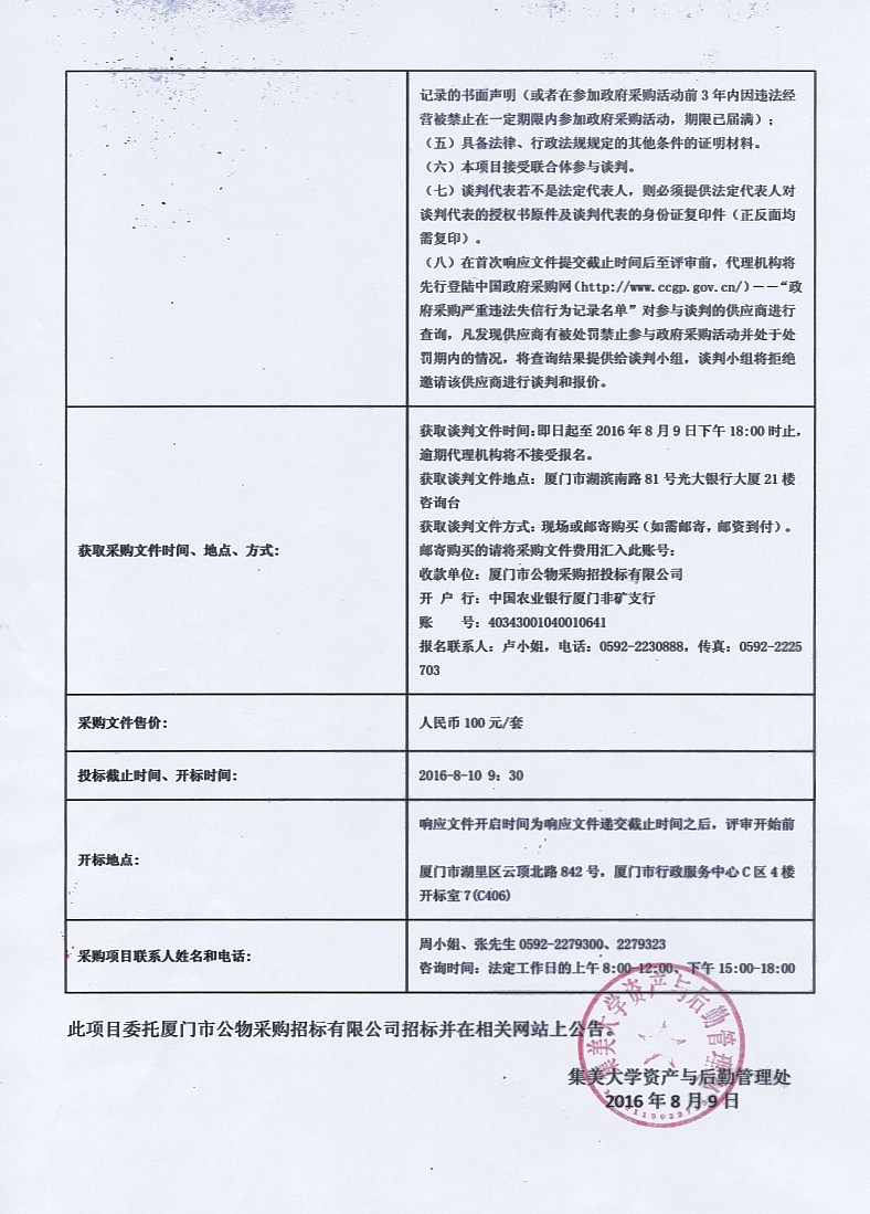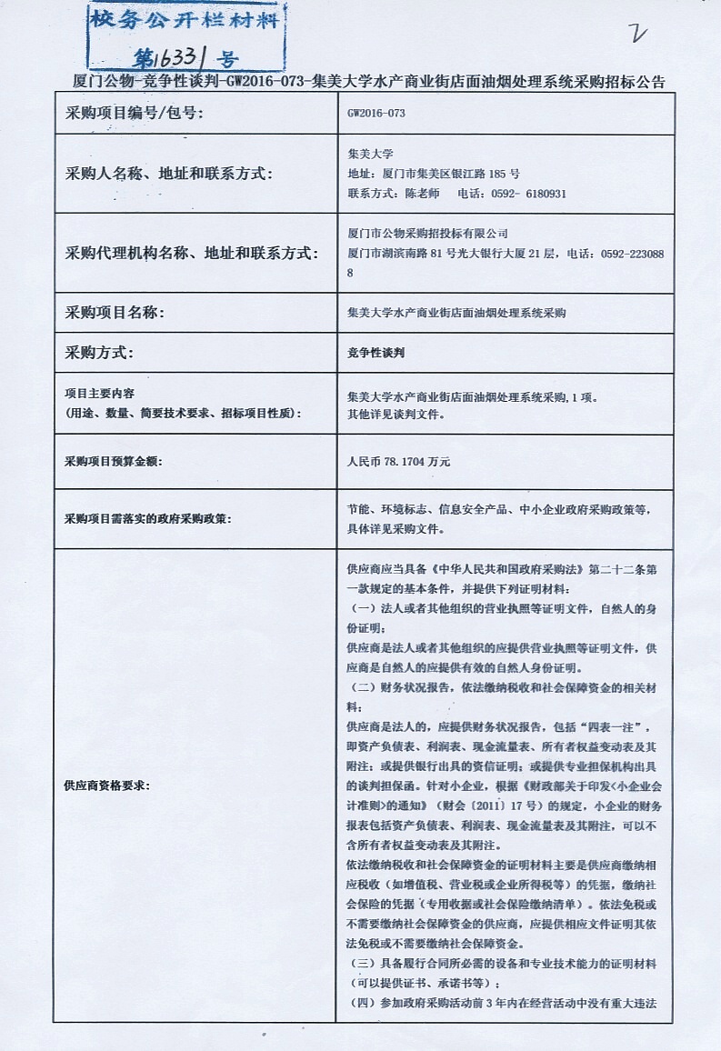 厦门公物—竞争性谈判-GW2016-073-集美大学水产商业街店面油烟处理系统采购招标公告