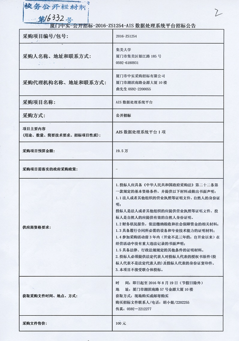 厦门中实—公开招标—2016—ZS1254-AIS数据处理系统平台招标公告
