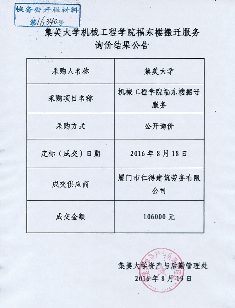 集美大学机械工程学院福东楼搬迁服务公开询价结果公告