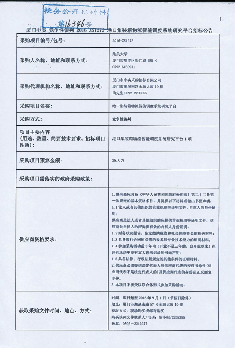 厦门中实—竞争性谈判—2016—ZS1272-港口集装箱物流智能调度系统研究平台招标公告