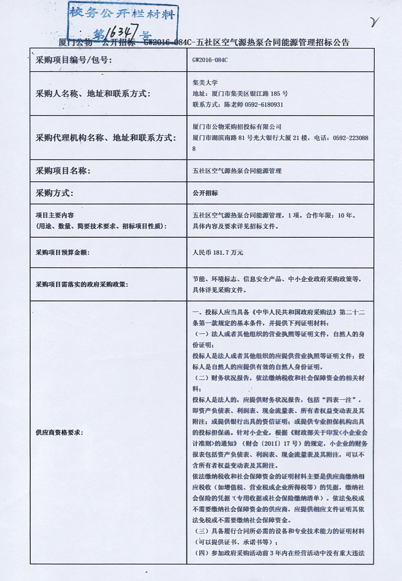 厦门公物—公开招标—GW2016—084—C—五社区空气源热泵合同能源管理招标公告