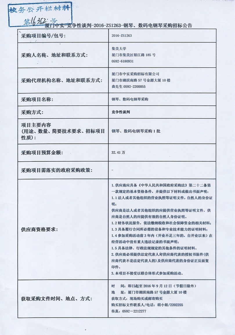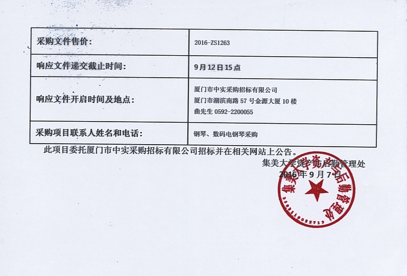 厦门中实—竞争性谈判—2016—ZS1263—钢琴、数码电钢琴采购招标公告