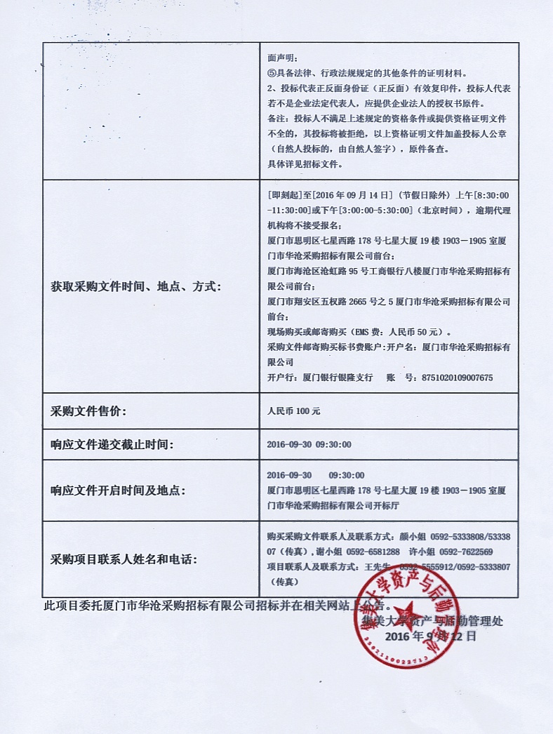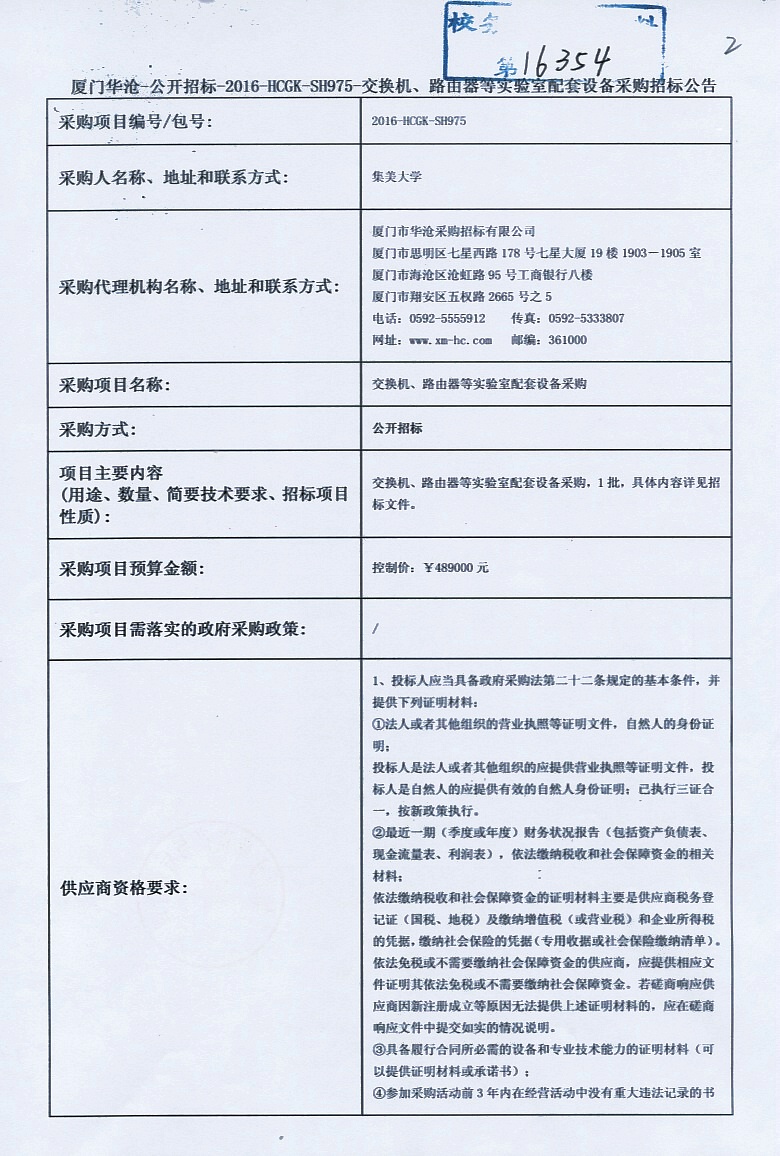 厦门华沧—公开招标—2016—HCGK-SH975-交换机、路由器等实验配套设备采购招标公告