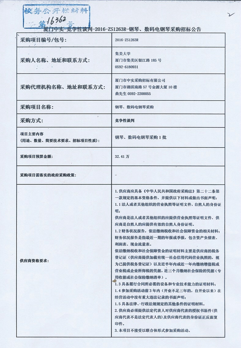 厦门中实—竞争性谈判—2016—ZS1263R-钢琴、数码电钢琴采购招标公告